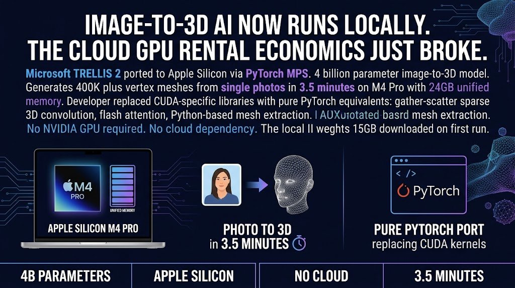 A developer just ported Microsoft’s image-to-3D AI model to Apple Silicon. No cloud required. No NVIDIA GPU needed....